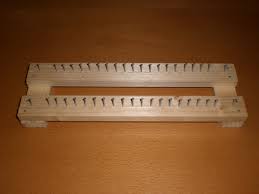 Para fazer o tear é só arranjar 4 pedaços de ripas, duas maiores de 50 cm e duas menores de 5 cm, pregar os pregos com uma distância de 1 cm. Devido ao comprimento das ripas menores, as duas maiores ficarão afastadas entre si na distância de 1 a 2 cm. É por esta abertura central que a peça tecida se desenvolve, descendo pelo centro do tear. Quanto maior a distancia, maior será o ponto obtido. No modelo apresentado no esquema a distância é fixa, mas você pode construir um modelo com a possibilidade de afastamento entre as laterais, através de parafusos.